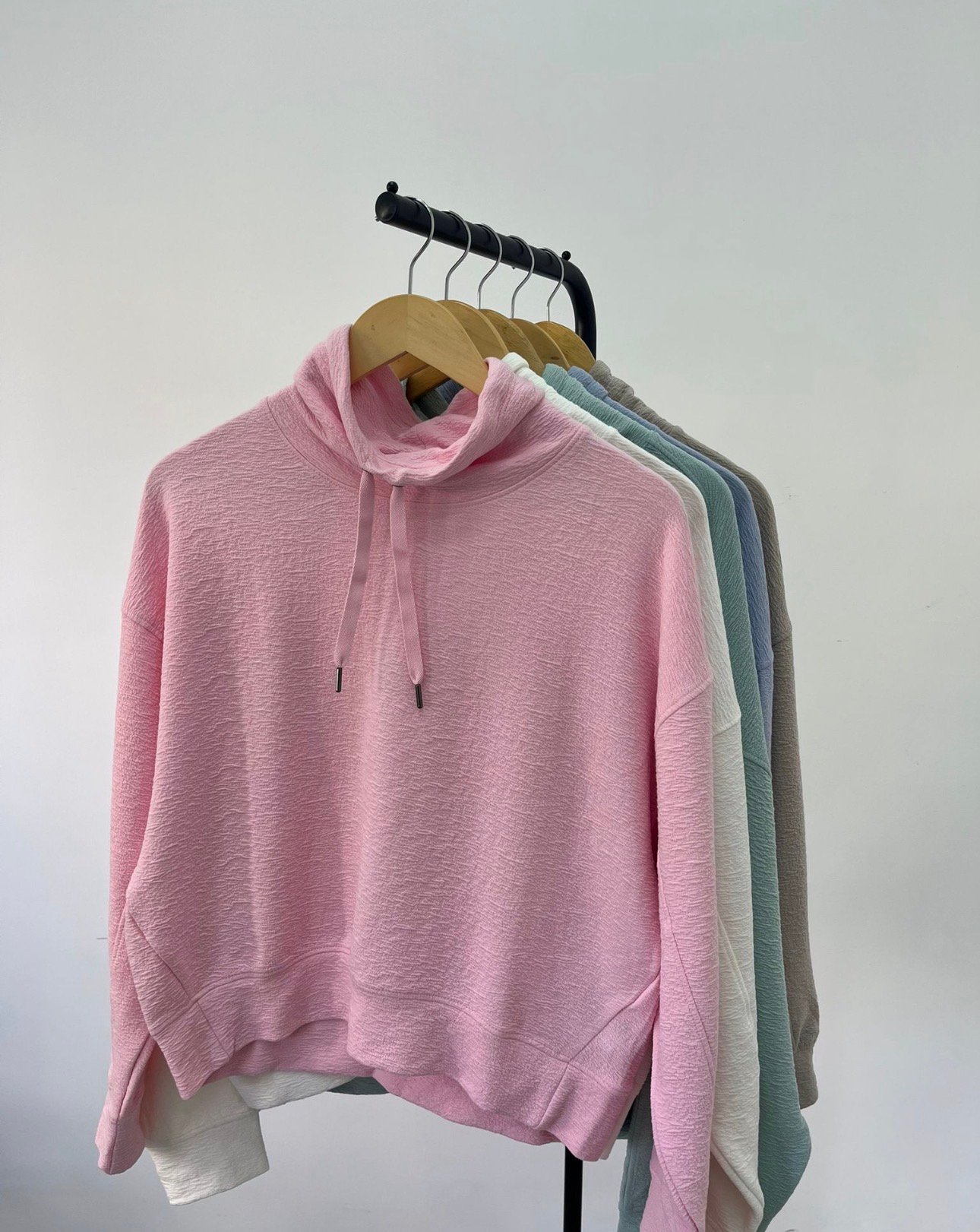 Vera es un buzo de corte crop con calce amplio y cuello alto con lazo regulable. Su textura suave y liviana lo convierte en una prenda ideal para el día a día, combinando comodidad y estilo en partes iguales.