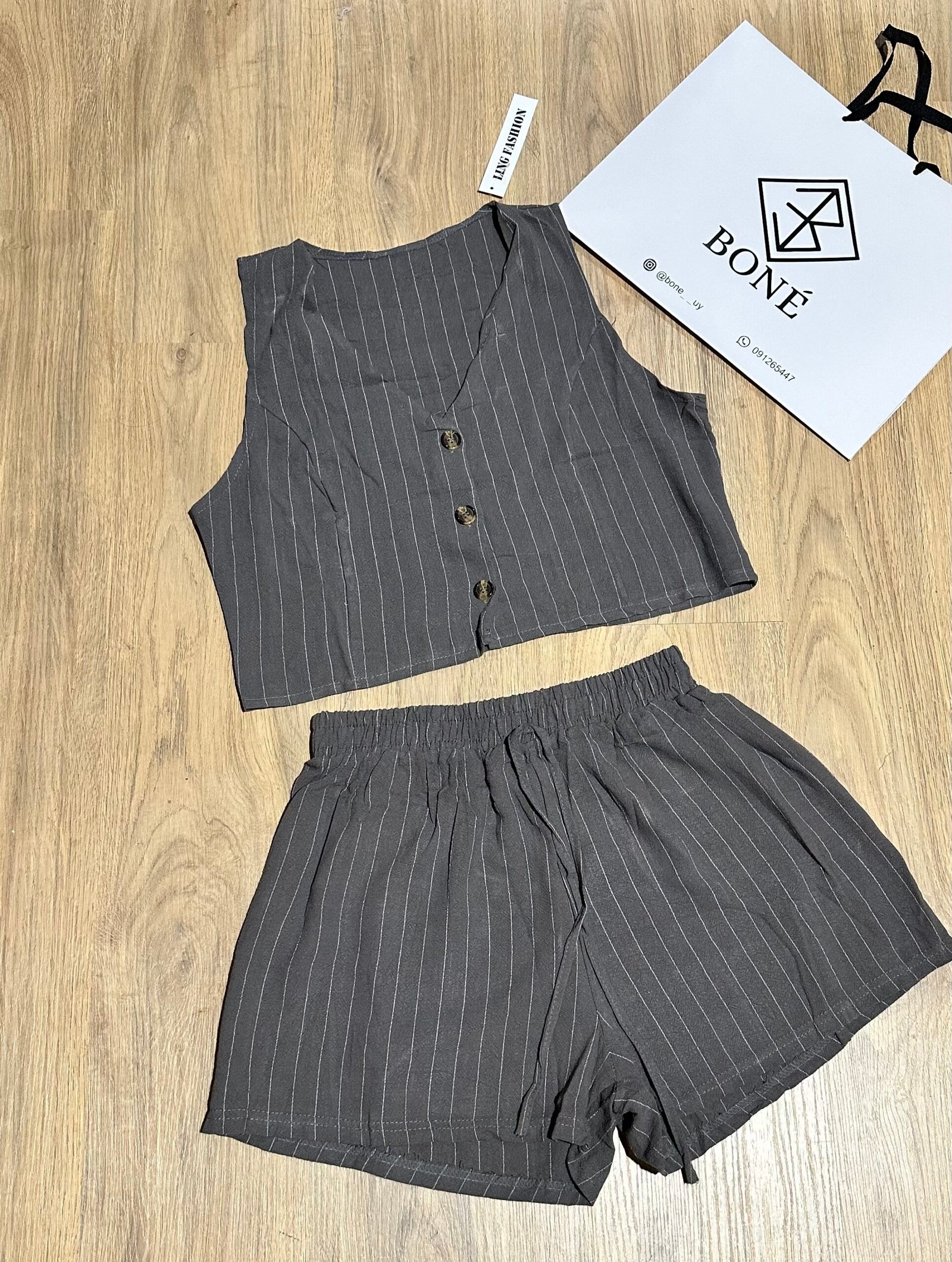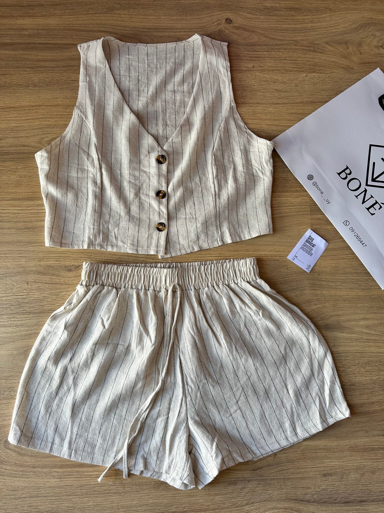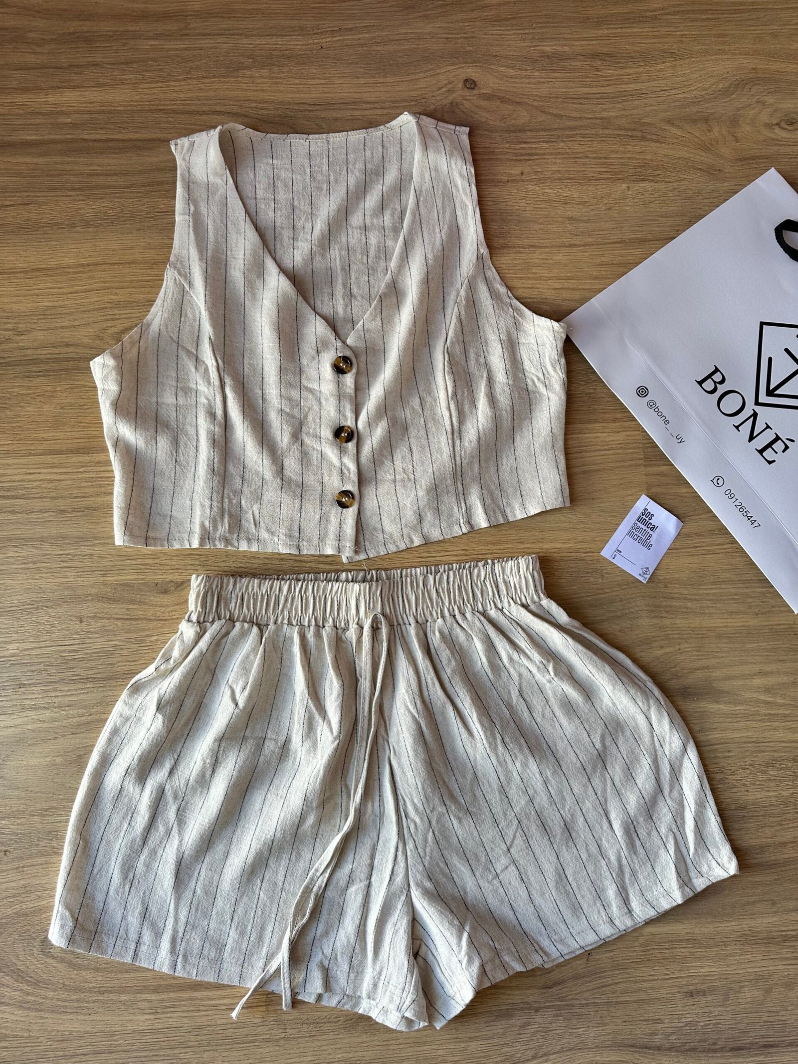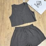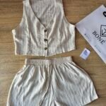 Nuestro conjunto Lina combina frescura, comodidad y estilo en una sola prenda. Incluye un chaleco corto con botones y un short de tiro medio con cintura elástica, ambos confeccionados en lino rayado liviano y suave. Perfecto para el verano, súper combinable y ideal para usar tanto de día como de noche.